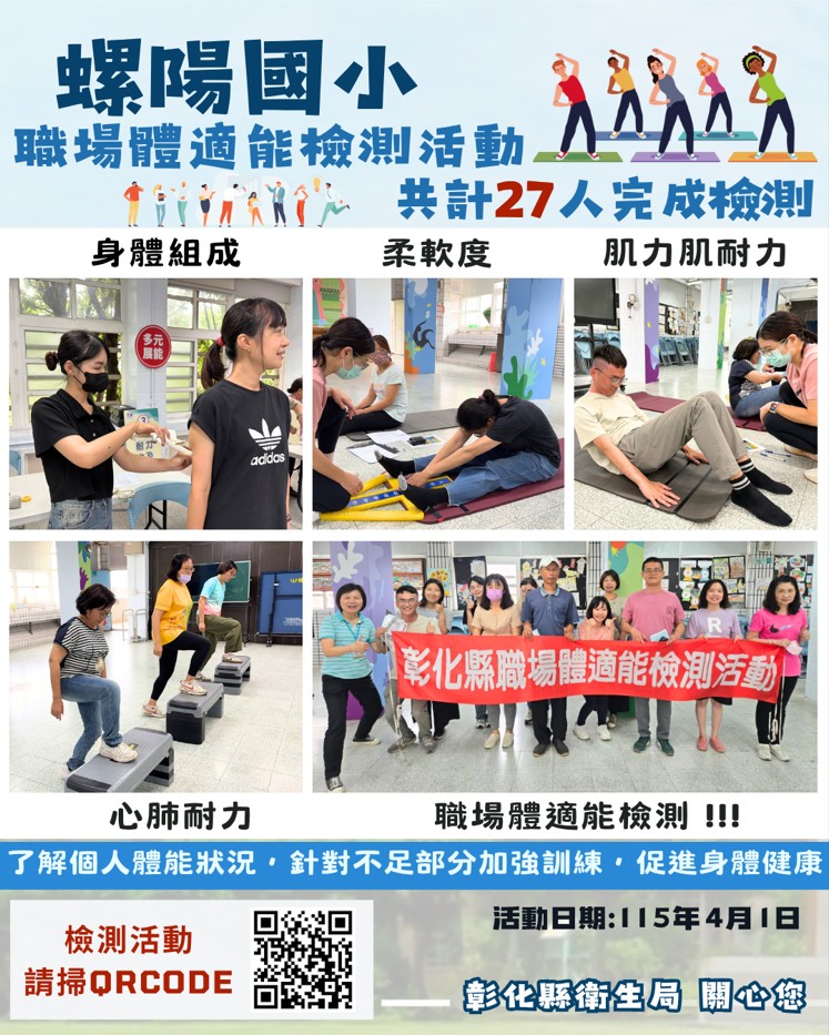 彰化縣衛生局115年4月1日於螺陽國小舉行職場體適能檢測活動,共計27名員工完成檢測。